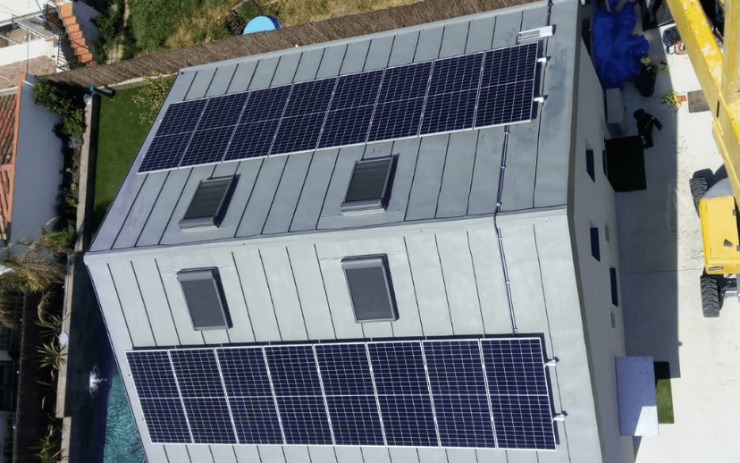 Mòduls fotovoltaics sobreposats a la coberta inclinada existent mitjançant anclatges fixats als plecs de la coberta de zinc.